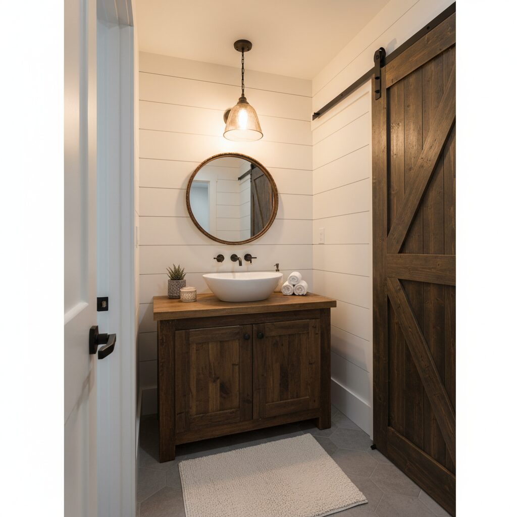 Bring the cozy and inviting feel of a modern farmhouse downstairs. This style works wonderfully in a basement setting. Install white shiplap on the walls to brighten the space and add texture. A sliding barn door makes for a stylish, space-saving entrance. Choose a vanity made from reclaimed wood and pair it with a trough sink and oil-rubbed bronze fixtures for an authentic, rustic touch.