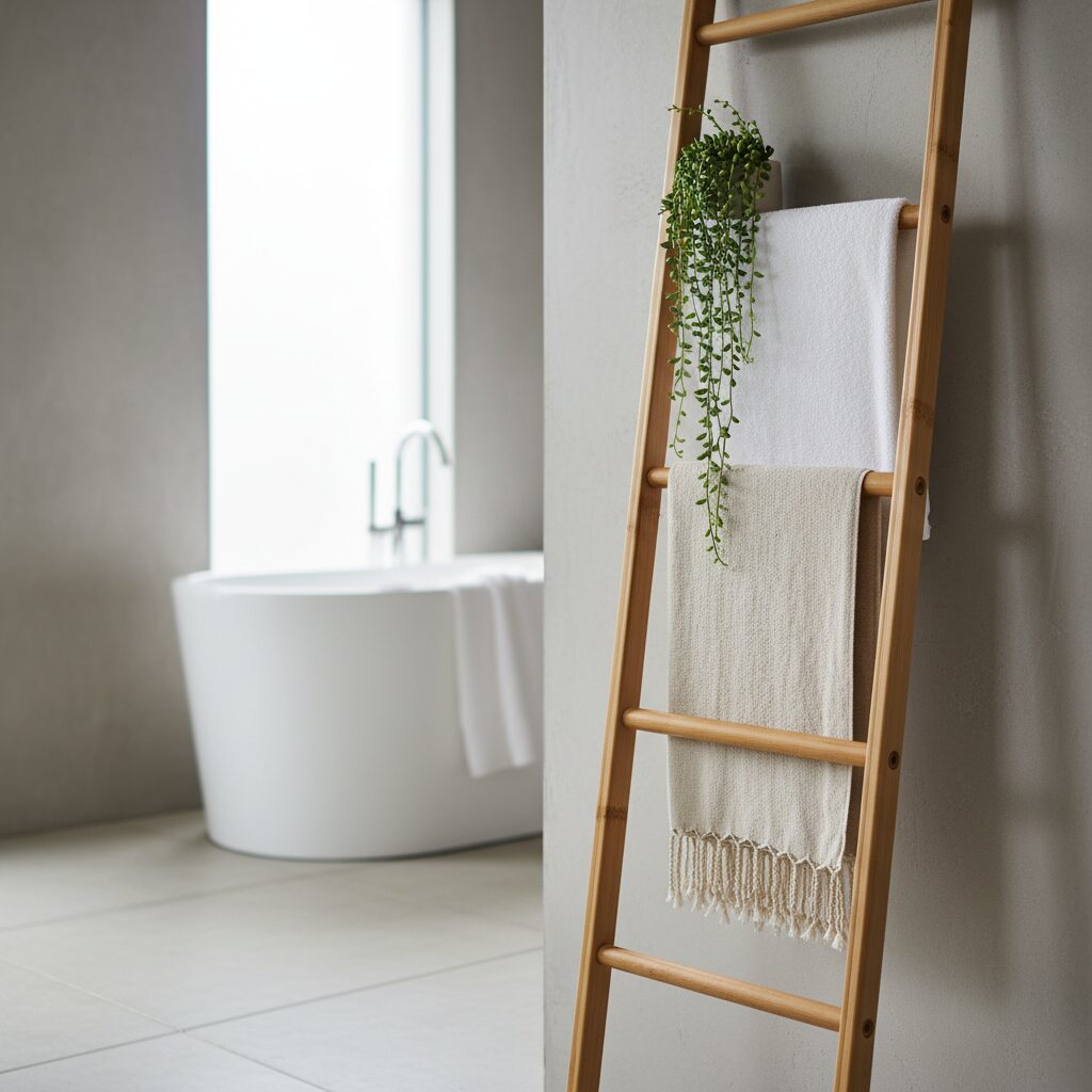 A leaning ladder is a chic and versatile decor element that’s perfect for bathrooms. It provides a casual, stylish spot to hang towels, store magazines, or even drape a small hanging plant. Choose a bamboo ladder for a spa vibe, a rustic wood one for a farmhouse feel, or a sleek metal one for a modern industrial look. It fills vertical space without any drilling required.