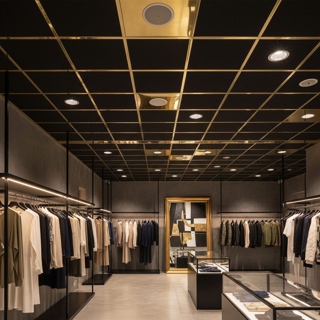 Who says the grid has to match? Create a striking graphic statement by pairing matte black tiles with a grid in a contrasting metallic finish. A gold, silver, or copper grid turns the ceiling into a deliberate design feature, outlining each tile and adding a touch of industrial opulence. This is a fantastic idea for creative studios, modern offices, or trendy cafes.