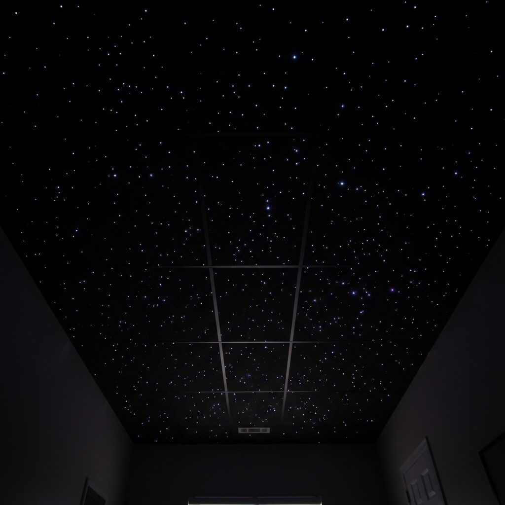 Transform a room into a magical escape by creating a starry night sky. This is achieved by embedding tiny fiber optic lights into black ceiling panels. When lit, they twinkle and shimmer, creating a mesmerizing celestial display. It’s an incredibly popular and breathtaking choice for home theaters, game rooms, or a child’s bedroom.