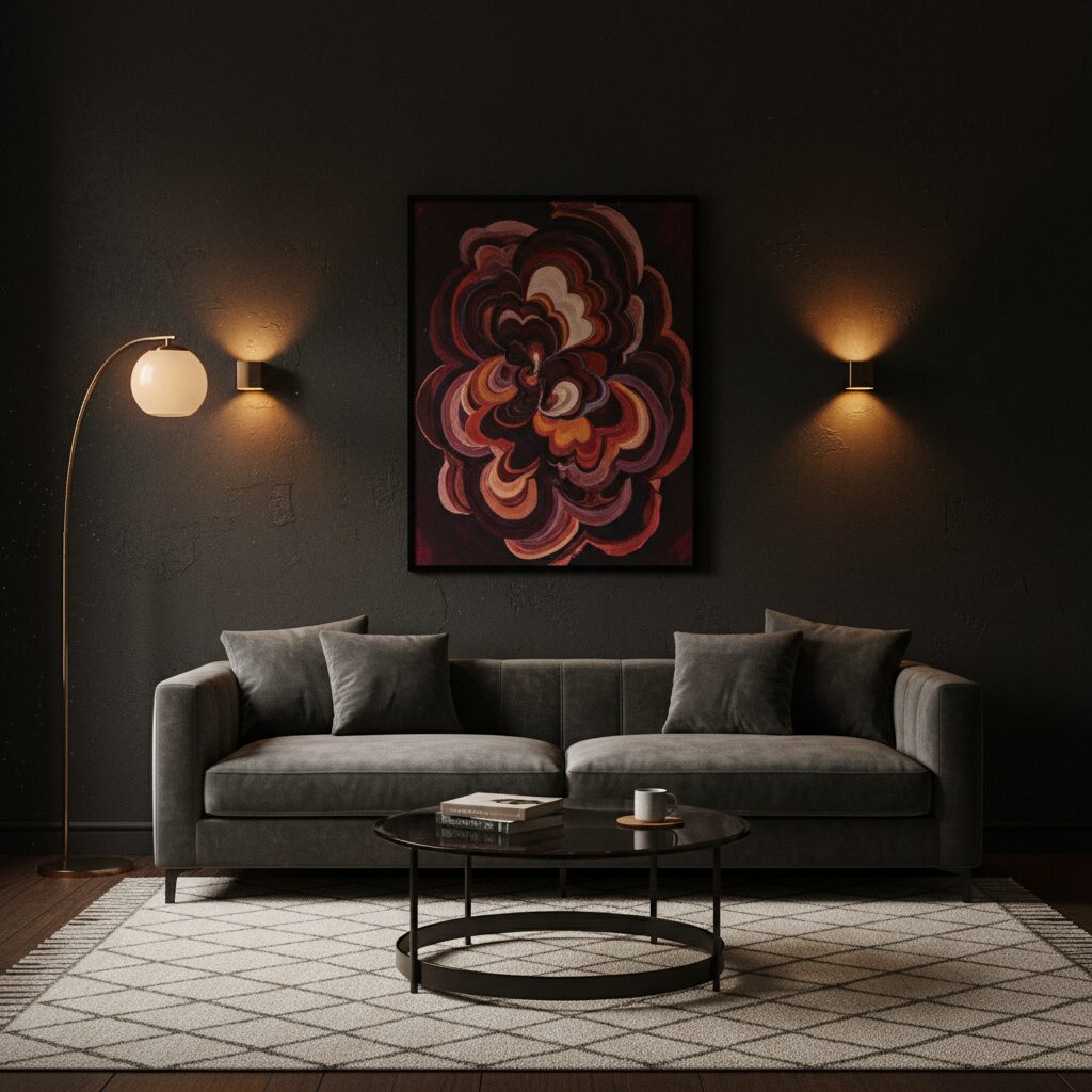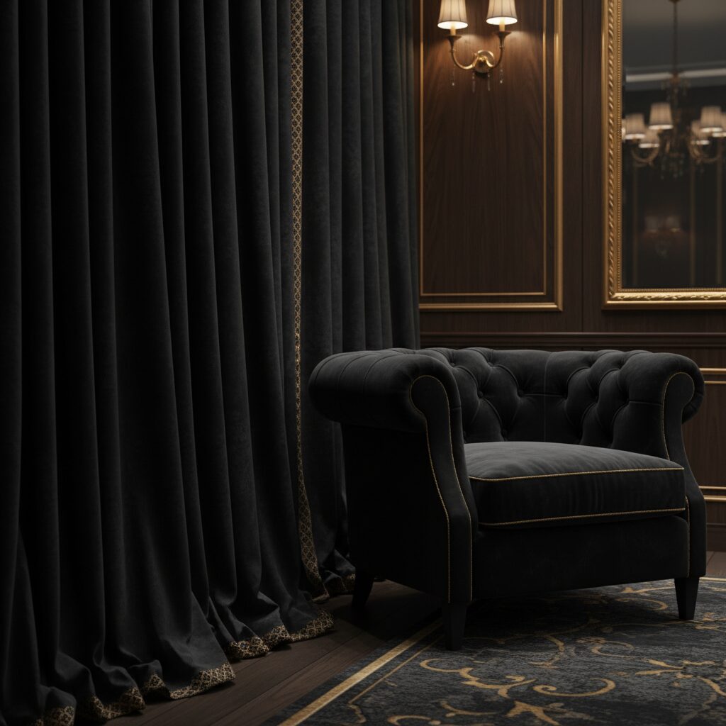 Texture is key to a successful dark room. Black velvet curtains or upholstery catch the light in a unique way, adding a sense of high-end luxury and softness. It transforms the space from simple to sumptuous instantly.