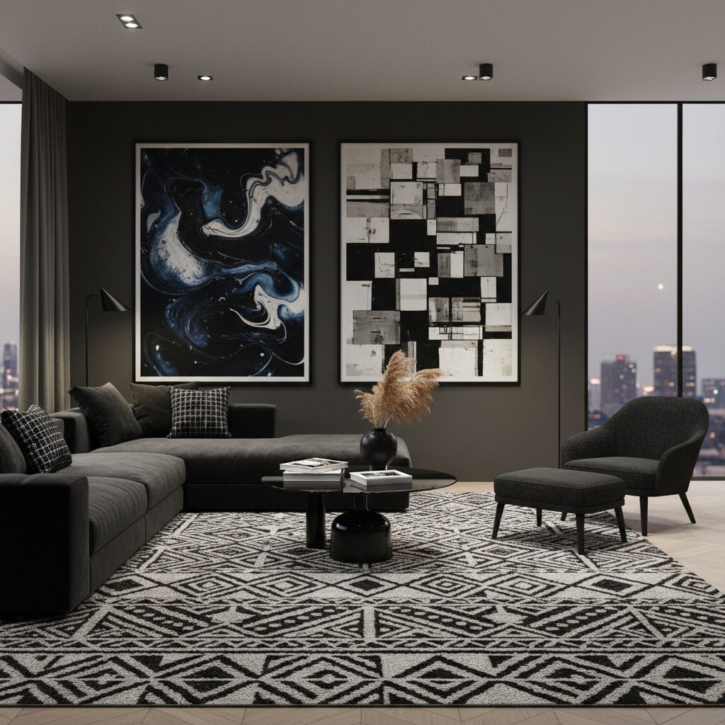 Monochromatic doesn’t have to mean solid colors. Introduce black-and-white patterns through area rugs, throw pillows, or abstract art to keep the eye moving. Geometric patterns can break up the darkness while staying true to the color scheme.