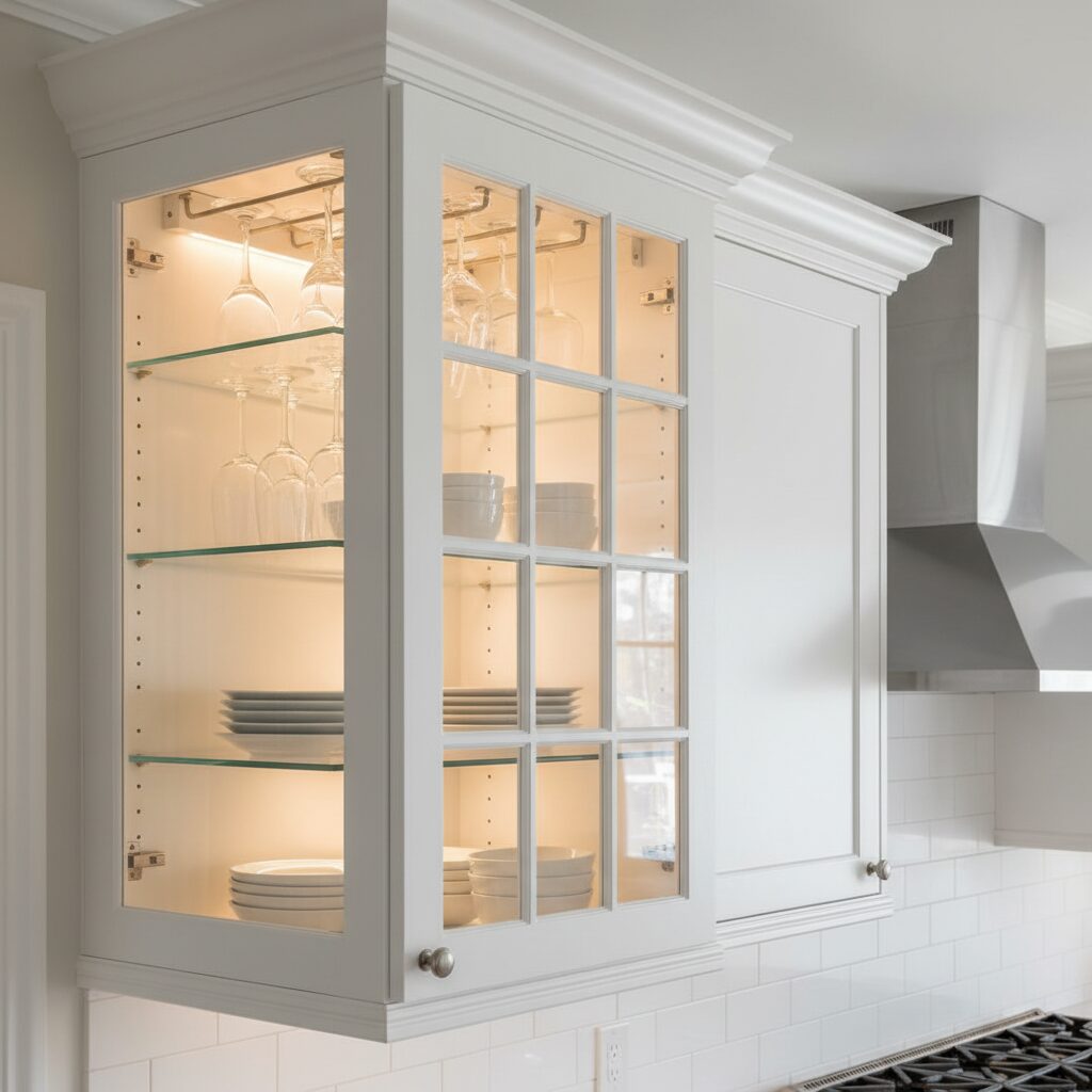 Break up a long run of solid cabinet doors and add a touch of elegance with a glass-front corner cabinet. Using clear, frosted, or textured glass in a diagonal or L-shaped upper cabinet visually lightens the corner and provides a beautiful display case for your best glassware, china, or decorative items. Add in-cabinet lighting to really make it shine.