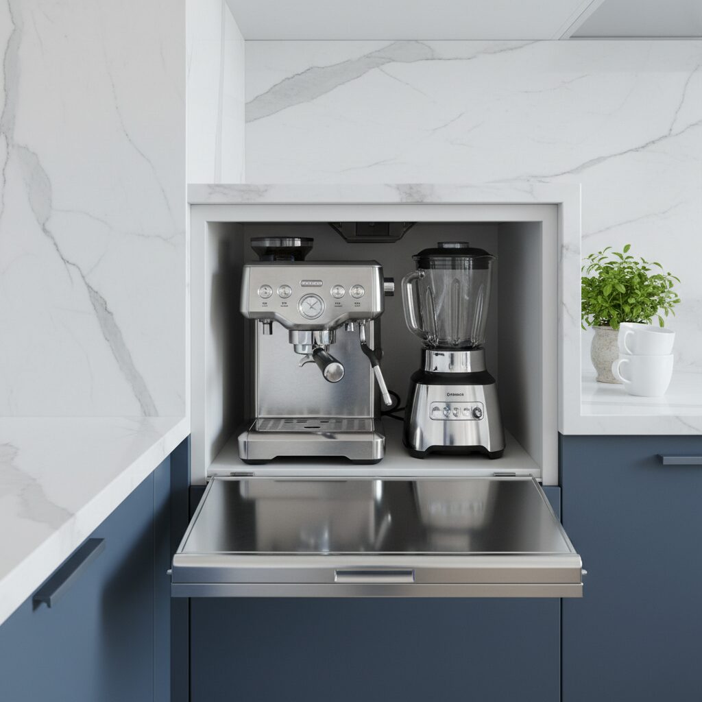 Keep your countertops pristine and clutter-free with a corner appliance garage. This is a cabinet that sits on the countertop, specifically designed to hide small appliances like your toaster, blender, and coffee maker. A tambour (roll-up) door or a lift-up door makes access easy, allowing you to slide appliances out when you need them and tuck them away when you’re done.