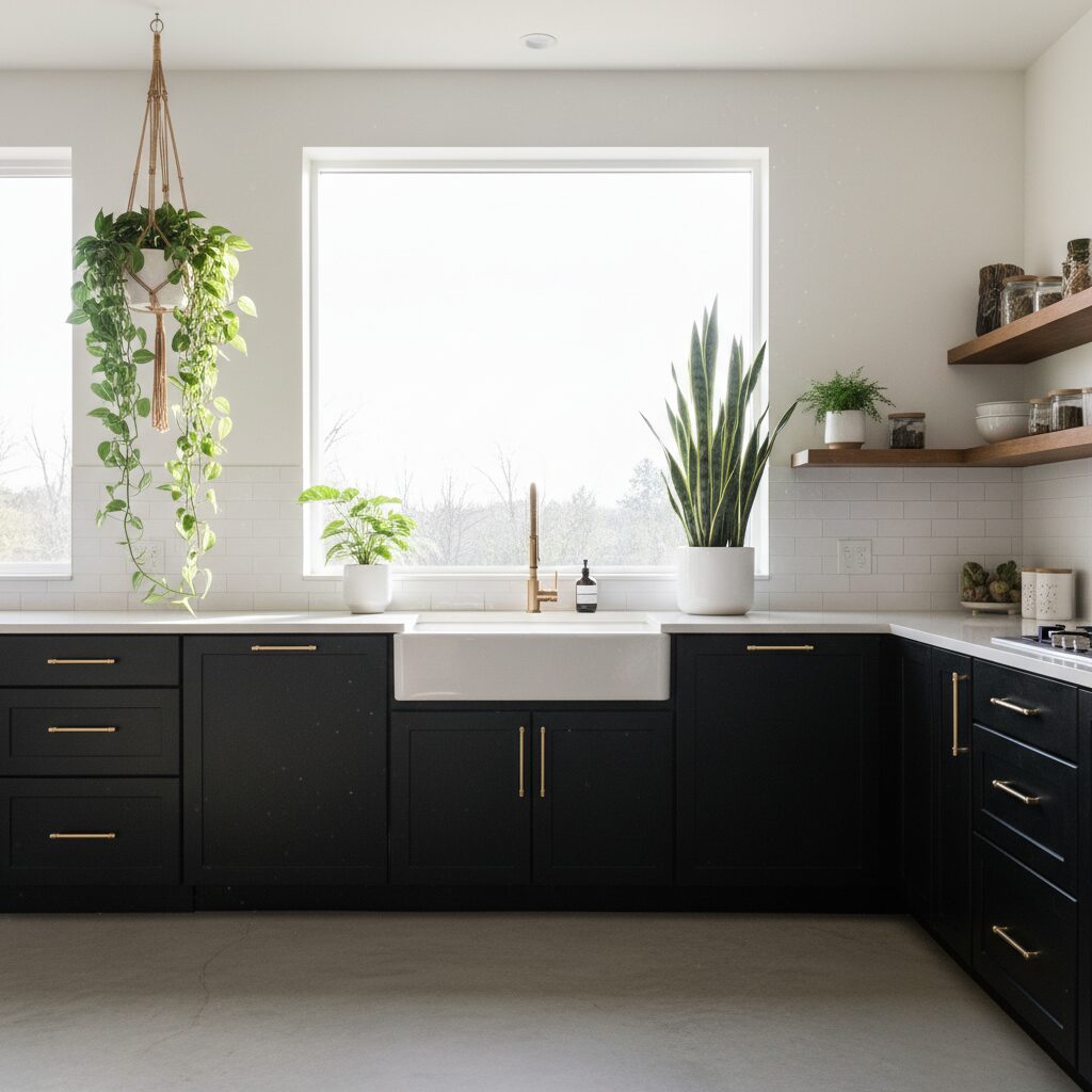 Black cabinets look absolutely phenomenal in a room flooded with natural light. The light prevents the dark color from overwhelming the space and highlights the finish of the cabinetry. Enhance this effect by bringing the outdoors in. Potted plants, hanging vines, and fresh herbs not only add a pop of natural color but also bring life and energy, creating a beautiful organic contrast against the modern black cabinets.