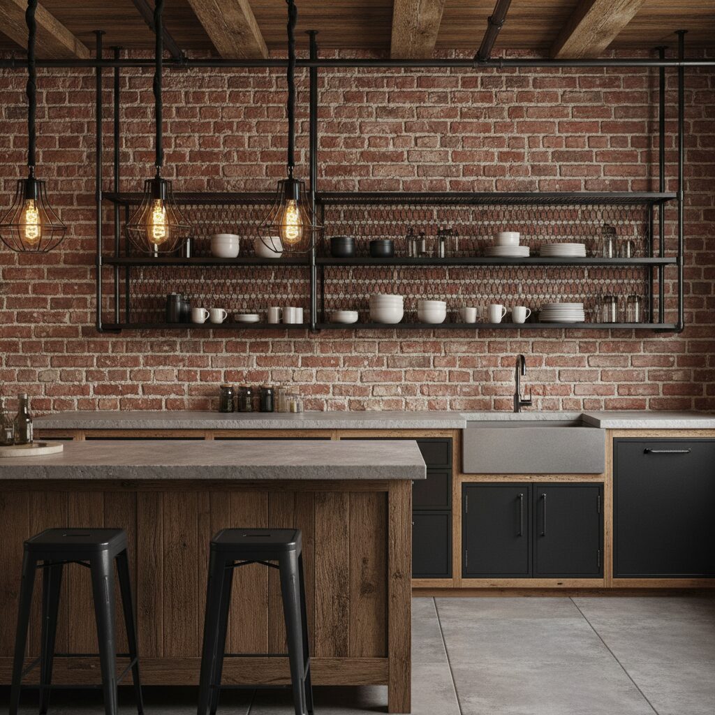 Create an edgy, urban vibe by combining black cabinets with raw, natural textures. An exposed brick wall serves as a stunning, rustic backsplash, providing warmth and character that contrasts beautifully with sleek black cabinetry. Complete the industrial look with concrete countertops, open metal shelving, and vintage-style pendant lights.
