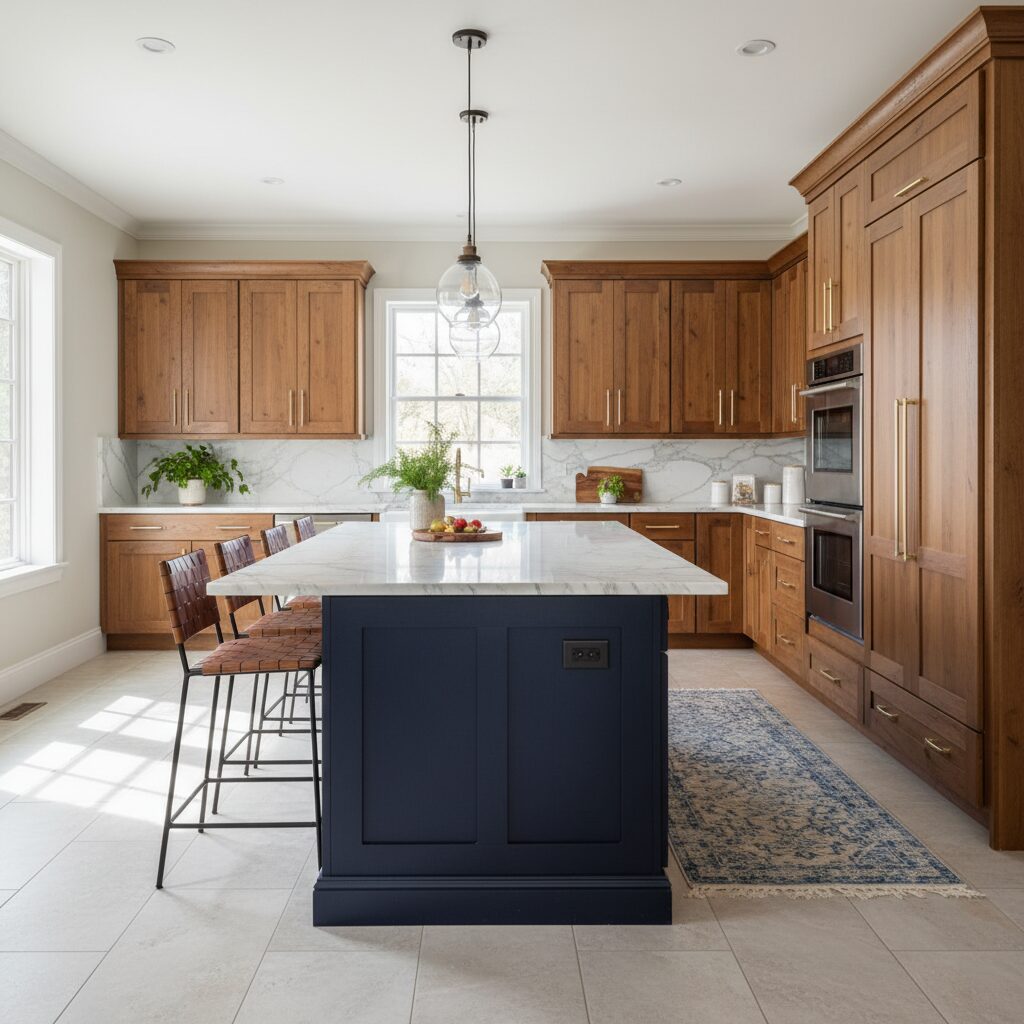 If you have a kitchen island, painting it a different color is a fantastic way to add visual interest and break up the wood tones. A deep navy blue, a rich forest green, or even a soft greige can provide a stunning contrast to your brown perimeter cabinets, turning your island into a true centerpiece.