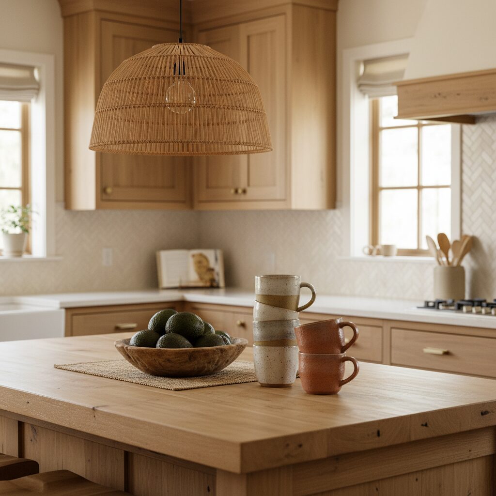 Enhance the natural beauty of your wood cabinets by layering in other organic textures. Think woven rattan pendant lights, a rustic wooden cutting board leaning against the backsplash, linen dish towels, and ceramic vases. These elements add depth and a sense of handmade charm, creating a kitchen that feels collected and warm.