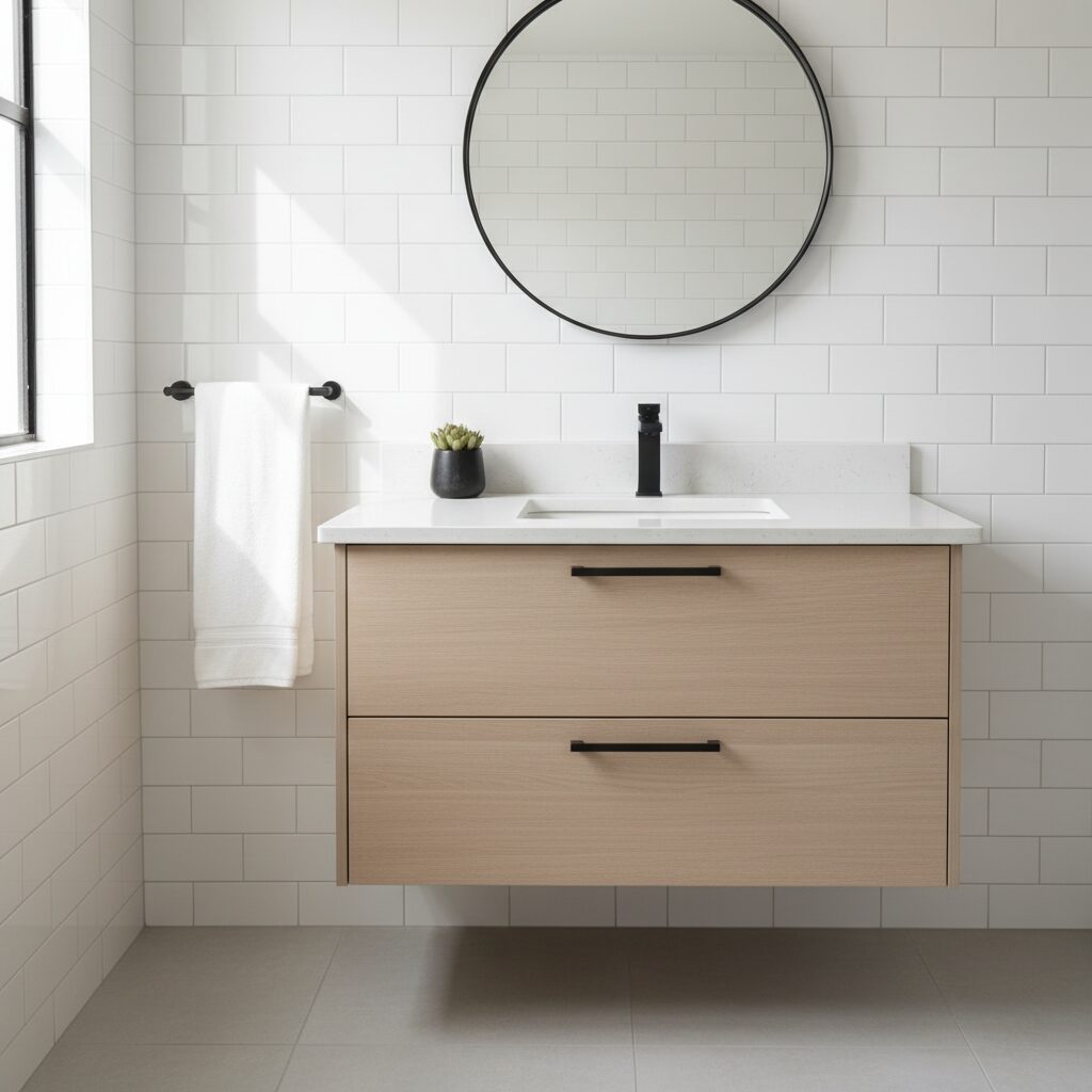 Combine the organic beauty of natural wood with soft, creamy whites for a look that’s both modern and inviting. A light oak vanity paired with cream-colored tiles and walls creates a Scandinavian-inspired feel. This combination is all about warmth and simplicity, making your bathroom feel like a cozy, light-filled retreat.