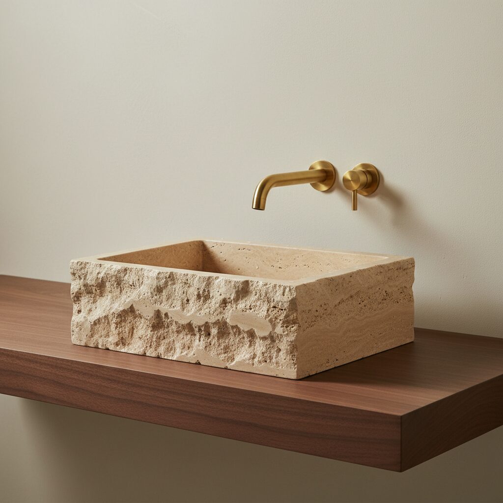 Introduce a powerful, organic element with a statement sink carved from natural stone. A travertine, marble, or river stone vessel sink acts as a functional piece of art. Placed atop a simple wooden vanity, it becomes the undeniable focal point of the room, adding a raw, earthy texture that is both beautiful and unique.