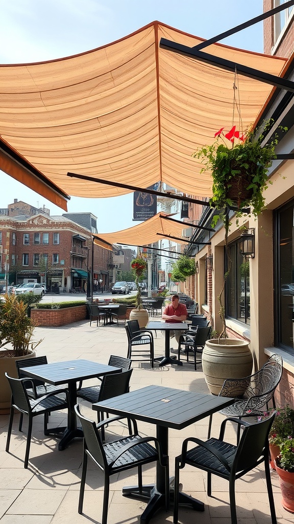 You’ll notice the modern black tables and sturdy chairs that complement the shaded area. These furniture choices are not just stylish but also practical, offering comfort while dining or socializing. Adding planters with colorful flowers enhances the look, bringing a touch of nature right to your table.