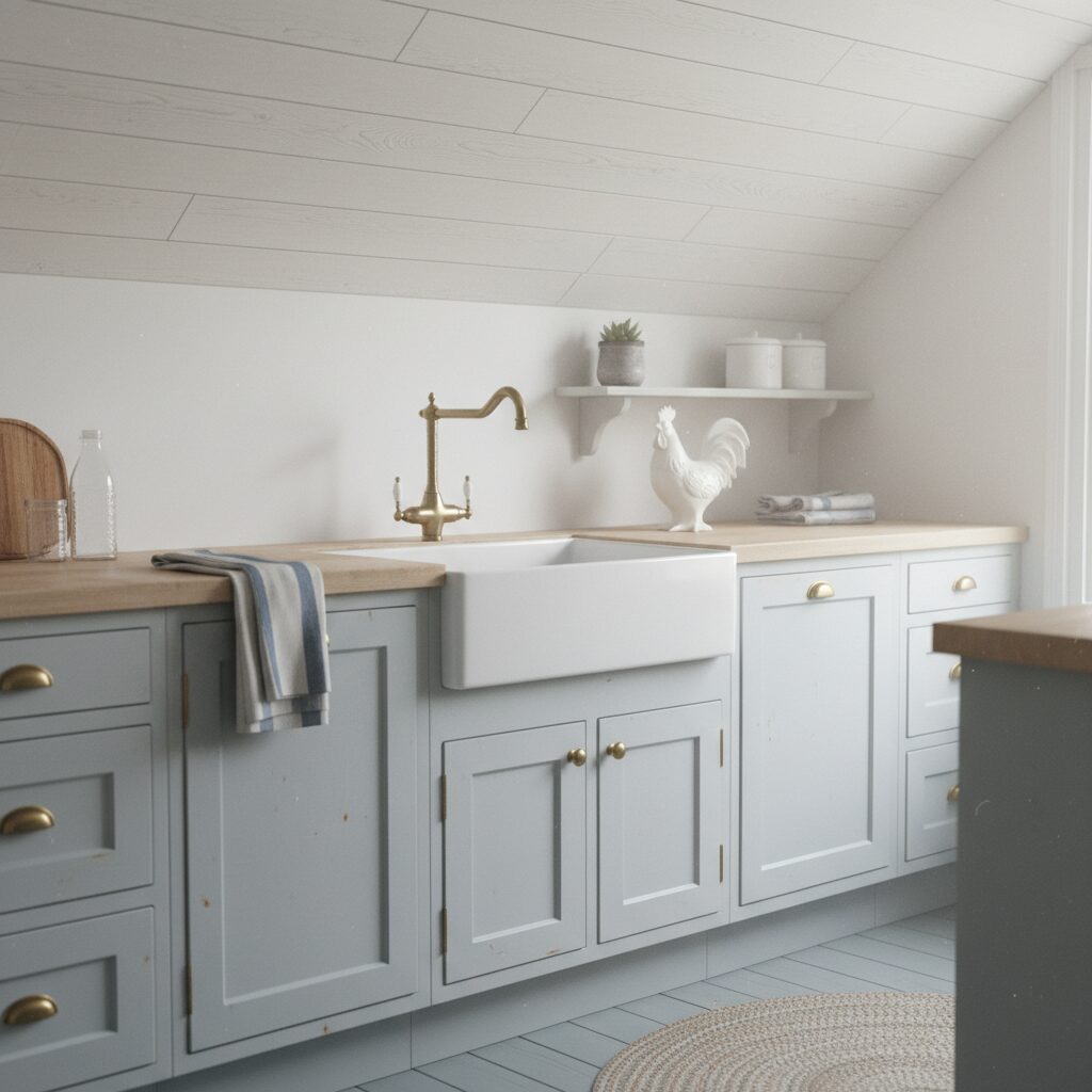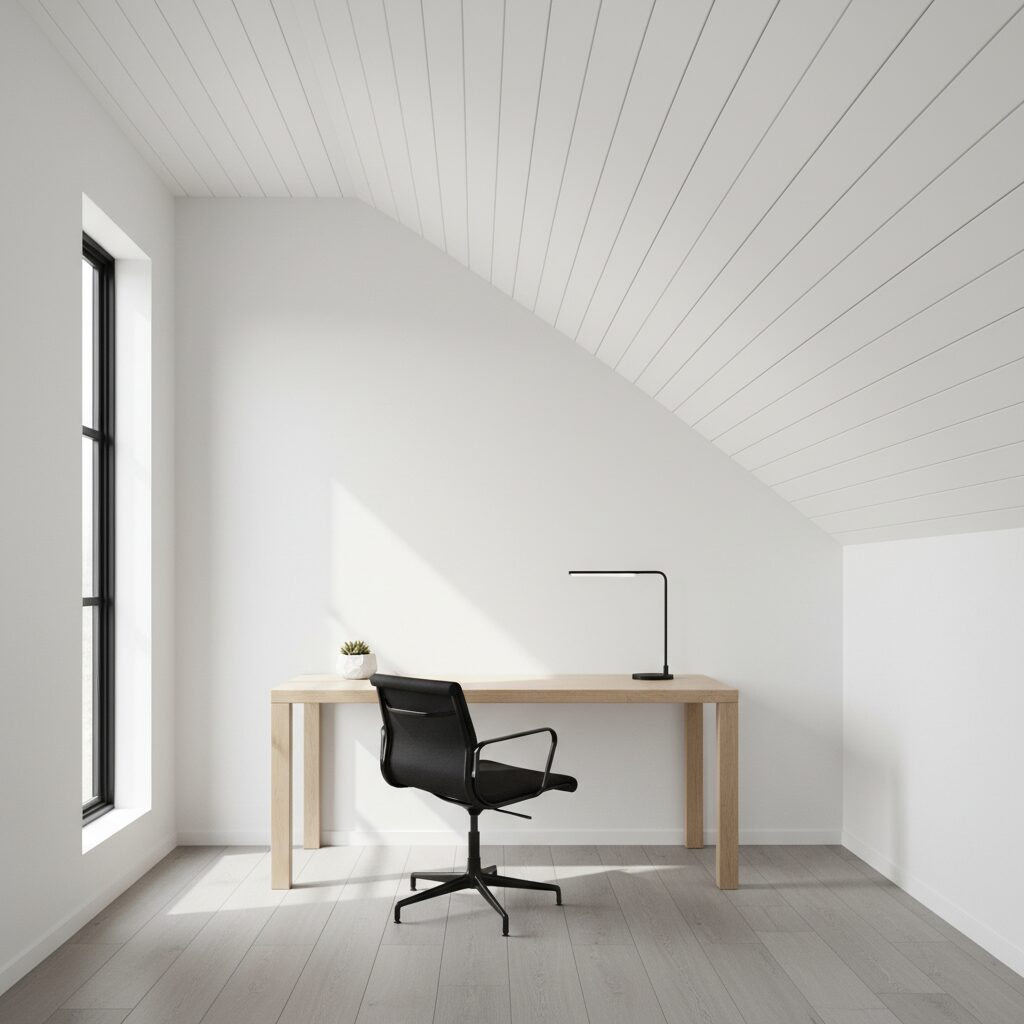 If solid white feels too stark but you still want a light and bright feel, a whitewashed finish is the perfect compromise. Whitewashing, or ‘pickling,’ involves applying a thin layer of watered-down paint, which allows the natural wood grain and knots to show through. The result is a soft, subtly rustic, and beautifully textured ceiling with an aged, lived-in charm.