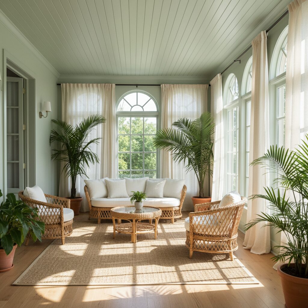 Capture the essence of a seaside retreat by painting your shiplap ceiling in a soft, coastal-inspired hue. A pale blue, like the sky on a clear day, or a gentle seafoam green can create a light, airy, and relaxing ambiance. This idea is perfect for sunrooms, bathrooms, laundry rooms, or covered porches to bring that vacation vibe home.