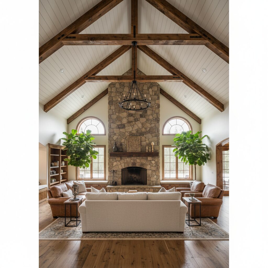 Combine two beloved architectural elements for a look that’s rich in character. Nestling crisp white or natural wood shiplap between rustic exposed beams creates a stunning contrast in both color and texture. This combination adds depth, dimension, and a powerful design statement perfect for great rooms with vaulted ceilings.