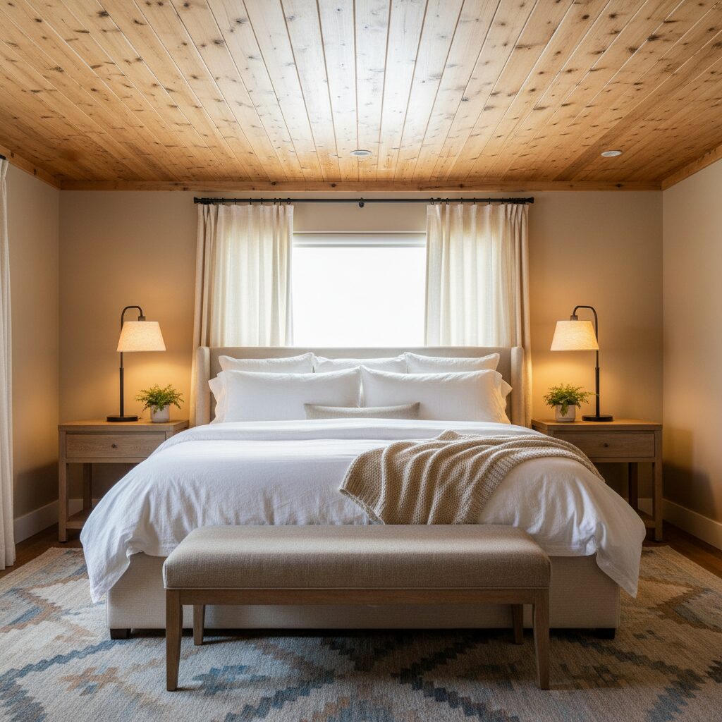 For a cozier, more organic feel, embrace the natural beauty of wood. A natural wood shiplap ceiling, whether it’s pine, cedar, or reclaimed barn wood, infuses a space with warmth and rustic charm. It’s the perfect choice for creating a snug cabin-like retreat in a master bedroom, den, or a home with exposed beams.