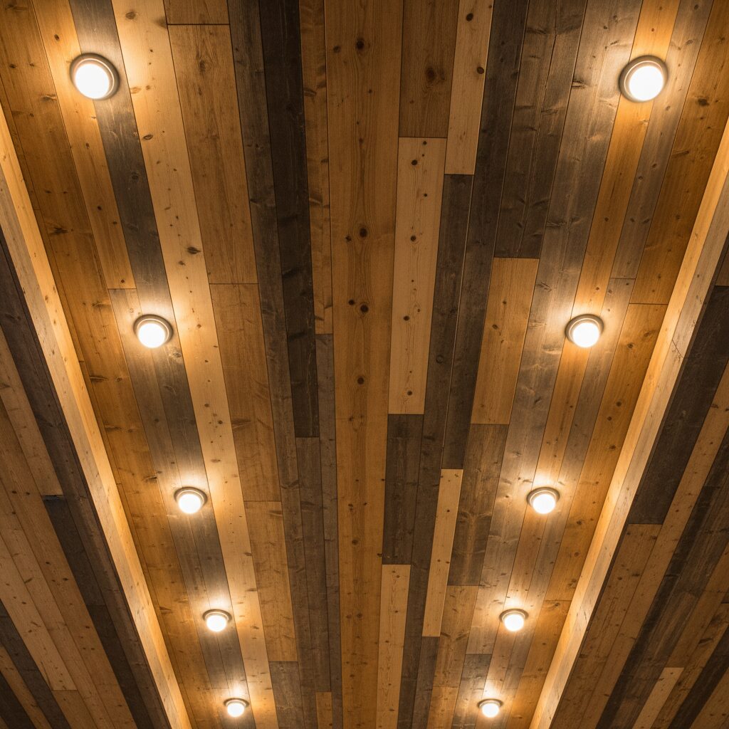 Create a truly custom and artistic look by installing wood planks with varying tones and finishes. This multi-tonal approach adds incredible visual interest and depth, giving the ceiling a dynamic, patchwork-like quality. It’s a perfect way to add a unique, rustic-modern touch to any room.